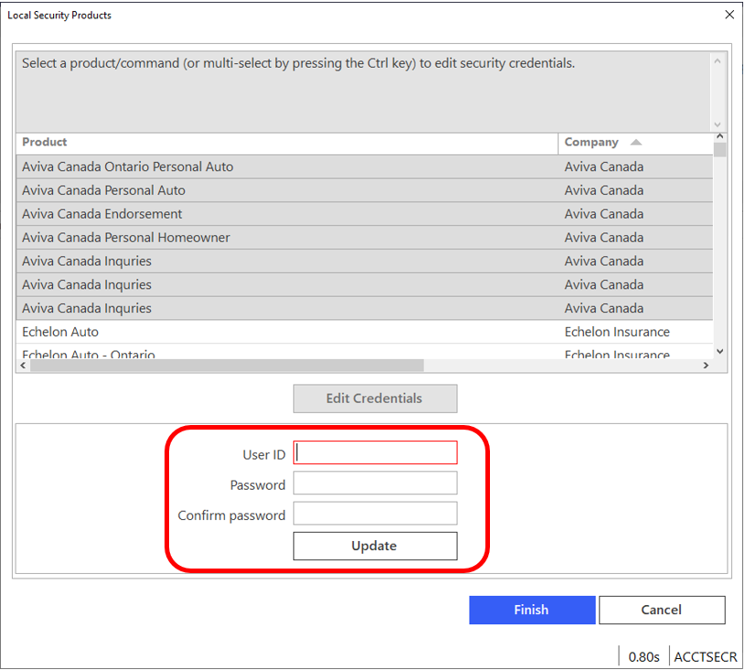 - In the Local Security Options screen, select the desired carrier products (hold SHIFT to select multiple), then click Edit Credentials.
